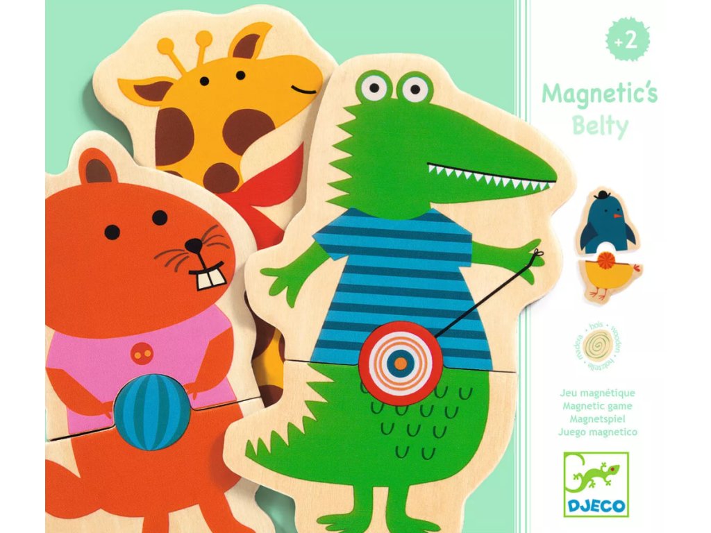 Motorická hra s magnetkami pre deti od 2 rokov. Z 24 magnetov si deti zložia 12 zvieratiek s loptami – napr. krokodíla, žirafu, králika, opicu. Zábavná možnosť pre deti je miešať magnetky medzi sebou a vytvárať tak nové a vtipné druhy zvieratiek. Dieliky majú ideálnu veľkosť pre malé detské ruky, dobre sa s nimi manipuluje.