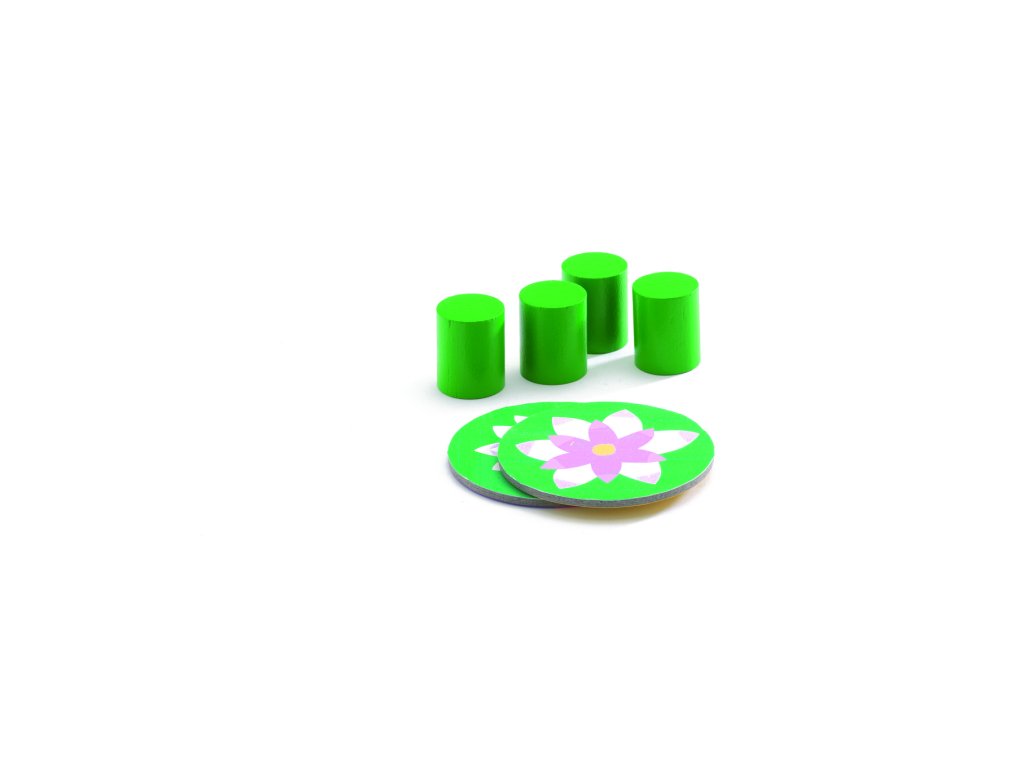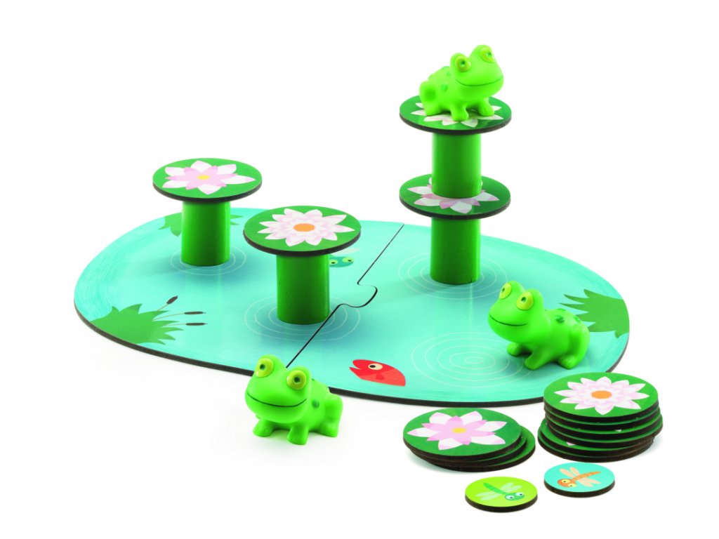 Zábavná hra od Djeco pre mladšie deti vo veku 2,5 až 5 rokov. Milé žabky, pestré obrázky a jednoduché pravidlá robia túto hru zaujímavou pre mladších škôlkarov. Pravidlá sa dajú prispôsobiť aj starším deťom. Začnite umiestnením rybníka do stredu stola. Hráči sa striedajú v stohovaní stĺpikov a žetónov s leknami, až kým im žiadne neostanú. Nakoniec sa na vrchol položí žabka. Ak má hráč pevnú ruku, získa bod a dostane žetón. Ak sa "vežička" zosype, hra začína od znova.