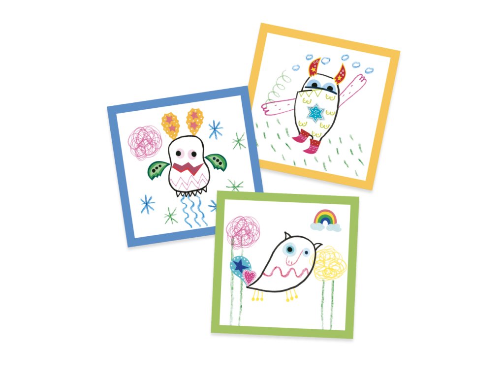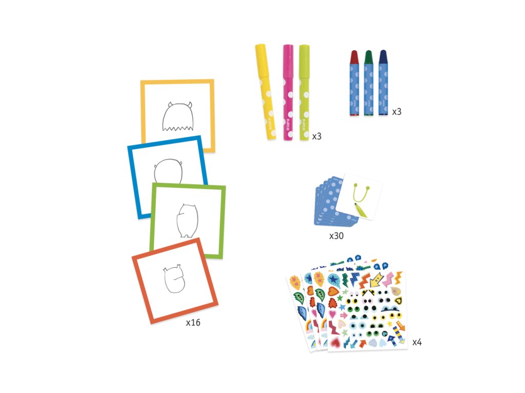 Sada špeciálne zostavená na spoločné tvorenie dieťaťa a rodiča. Vyberte si papier s farebným rámčekom, ktorý zaplníte vašimi kresbičkami. Na kartičkách máte k dispozícii konkrétne nápady: tipy na kreslenie, farby a odporúčanie, či použiť fixku alebo voskovku. Nakreslený výtvor ešte doplníte samolepkami a dielko bude hotové! Sada je tematicky zameraná na príšerky.